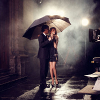 a black outfit with a dress that has short sleeves. They are both holding onto the same umbrella. There is a filming setup behind them, indicated by the presence of cameras and lights, suggesting that they might be actors on