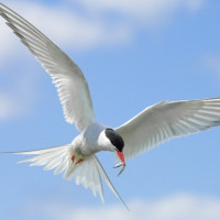 На снимке изображена птица, которая кажется чайкой на основе своего характерного белого оперения с серыми и черными кончиками крыльев. Он летит по небу с широко расставленными крыльями, демонстрируя отличительный узор крыла, типичный для этого вида.