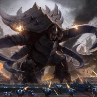 flying vehicles adds to the dynamic and intense atmosphere of the scene. It's clear that this image is from a game related to the Starcraft series, known for its real-time strategy gameplay featuring various species engaged in interstellar warfare.