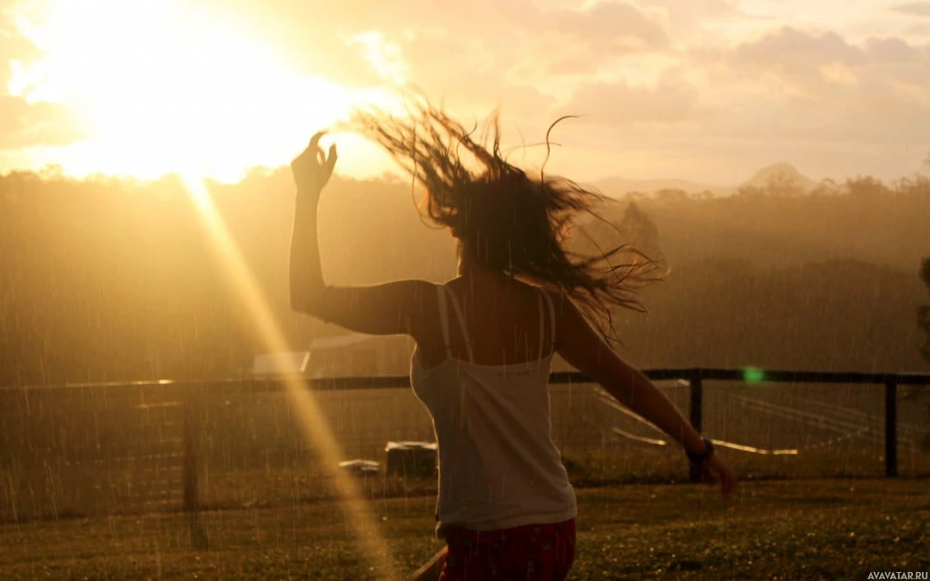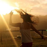 The image shows a woman from behind, running with her arms outstretched and hair flying in the wind. She appears to be enjoying herself on what looks like
