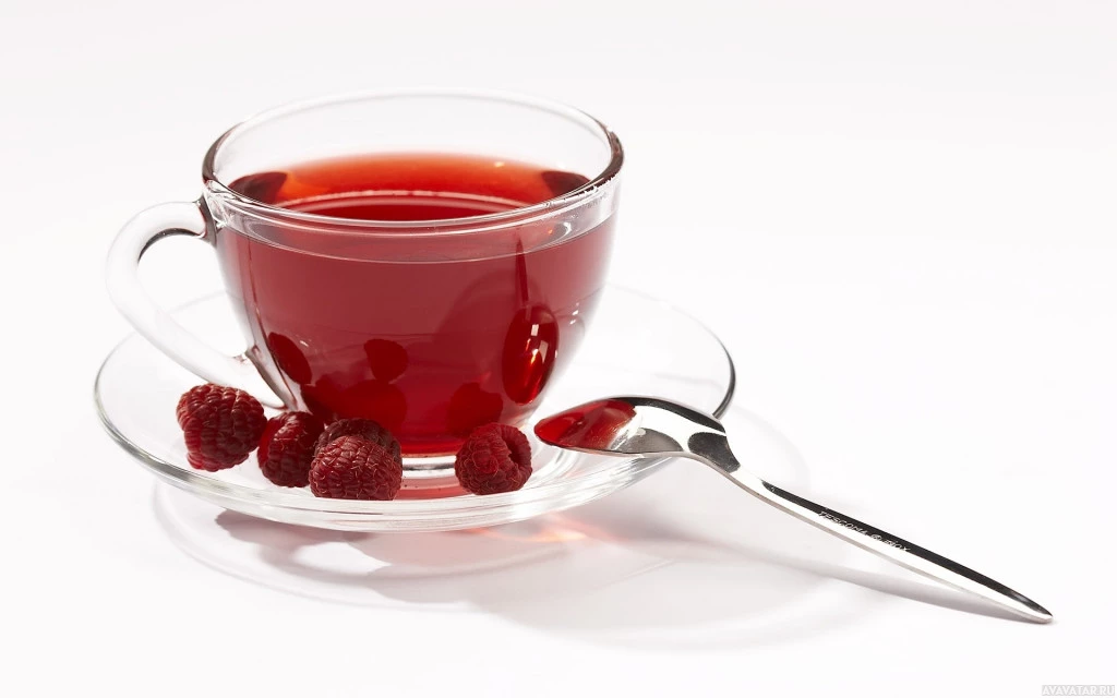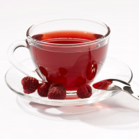 a cup of tea with berries, which could be raspberries or blackcurrants. The tea appears to be red and has