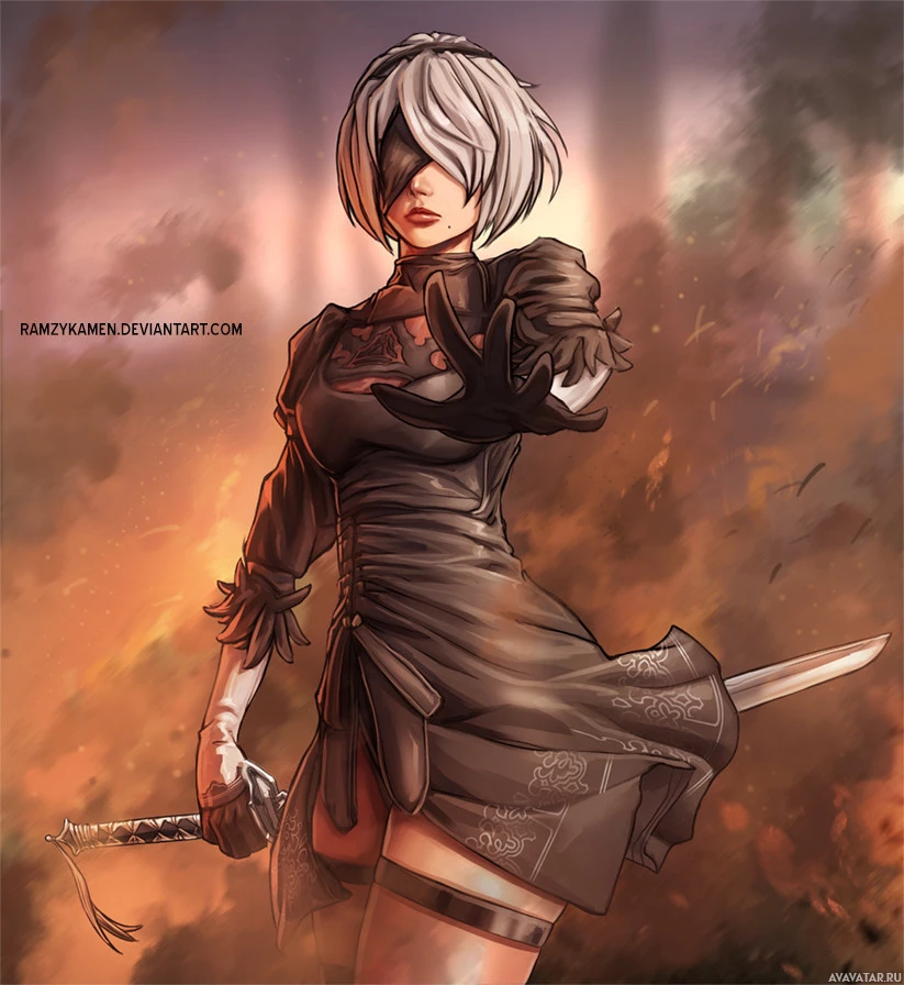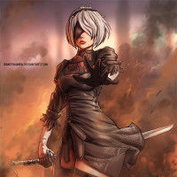 a female warrior with a mechanical arm and a sword in her hand. She is wearing a dark outfit with decorative elements that suggest she may be from