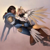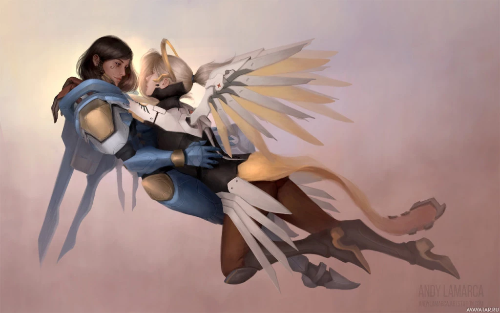 the video game "Overwatch." On the left, there is a character known as Mercy, who is a healer with white wings, and on the right, there is another character wearing