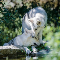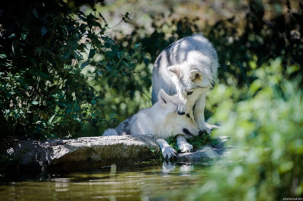На картине изображены два волка, один взрослый и один молодой, возле водопоя. Они оба плавают в воде, их тела частично погружены в воду. Кажется, что это солнечный день, учитывая освещение на изображении.