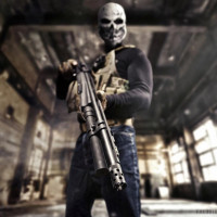 a skull mask and holding what appears to be a tactical rifle. They are standing in