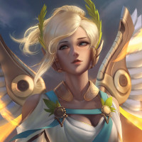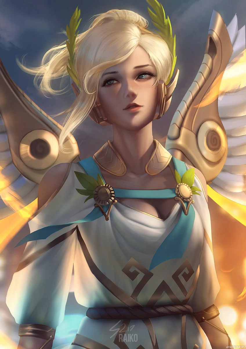 blonde hair styled in a side-swept manner, wearing what seems to be a fantasy or mythological-inspired armor. The armor includes wings and other ornamental elements, giving her an angelic appearance. Her expression is one of contemplation, and the background suggests