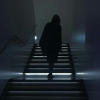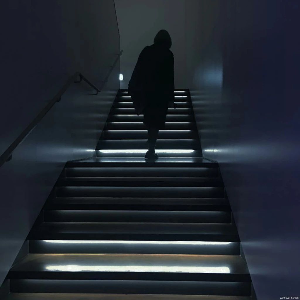dark clothing, and the image has been taken with a focus on the back and upper body, which creates a hooded effect for the silhouette. There are no visible objects that could be considered ladders in this context. The steps are lit from beneath, which contrasts with the person's form, making it stand out prominently against the background.