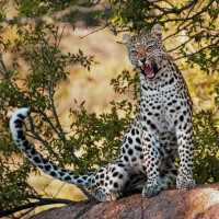 natural habitat, possibly a savanna or grassland. The leopard is looking directly at the camera with its mouth open as if it's roaring or growling. It has a distinctive