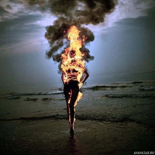 На картинке изображен человек, идущий вдоль побережья, с огнем, исходящим из его тела. Вполне вероятно, что этот образ инсценирован или им манипулируют в художественных целях. В этой картине нет реальных людей или животных, находящихся в опасности; это скорее художественное или концептуальное представление, чем изображение реального события.