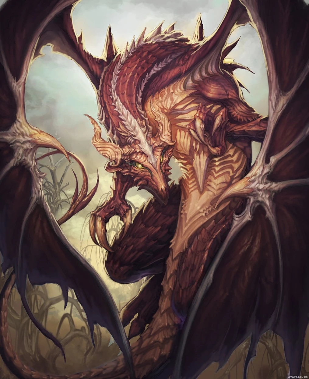 На картинке изображена тематическая иллюстрация дракона. Он характеризуется своими большими крыльями, колючими чешуйками и яростным выражением, когда он ревет или воет. Художественный стиль детализируется и предполагает сцену, которая может быть из книги рассказов или фэнтезийной игры.