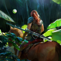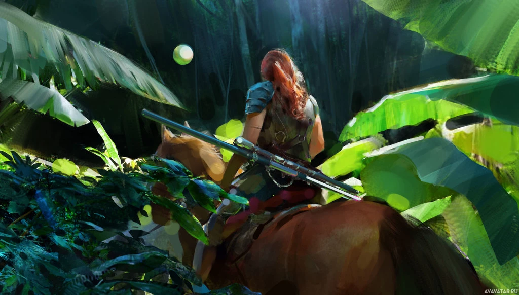 The image depicts a red-haired girl from behind, seated on a horse and holding what appears to be a sword or a bow. She is in a forest setting with