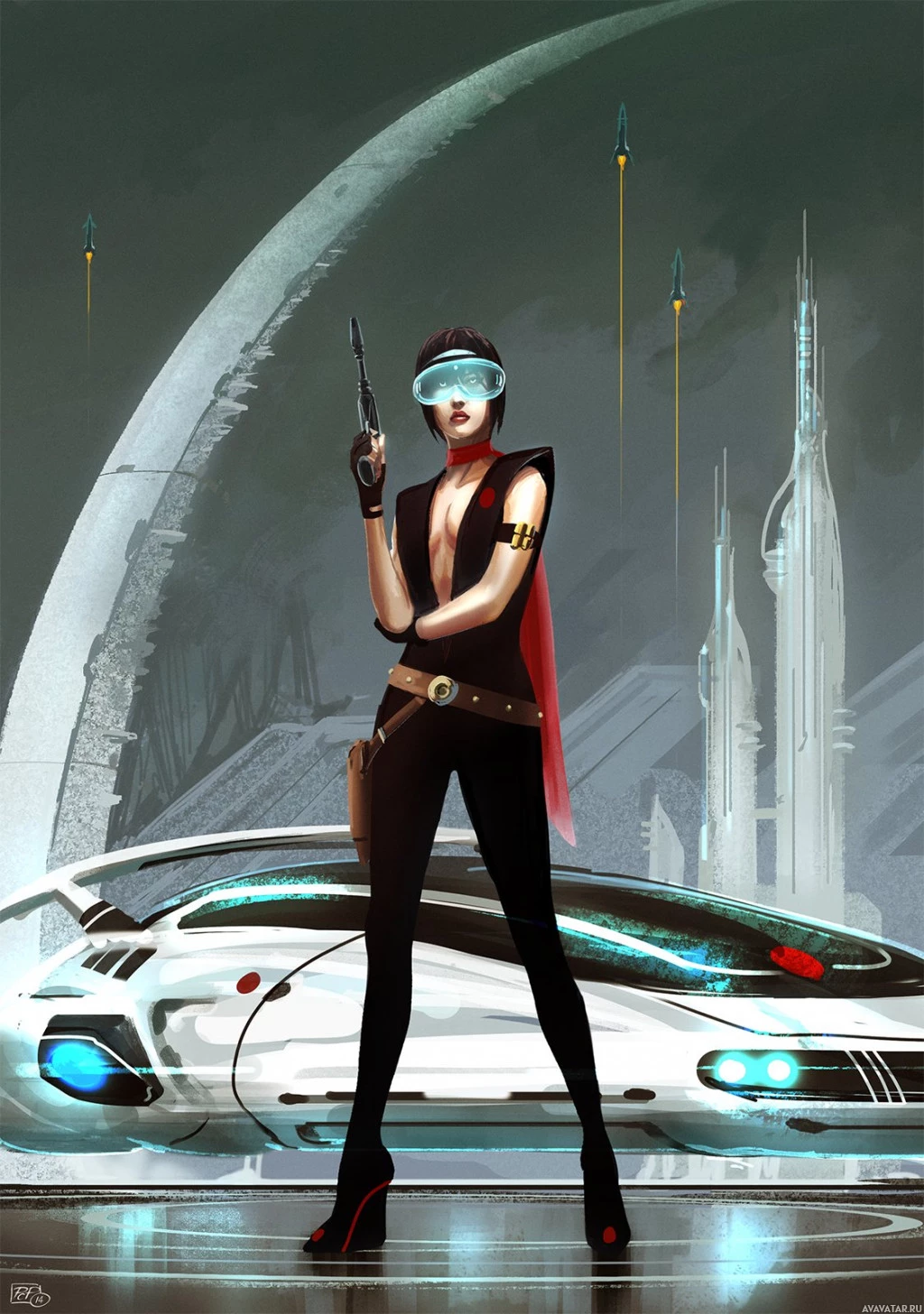 a black outfit with a red cape and a bandana around her head, which suggests an air of mystery or intrigue. Behind her, there are futuristic elements such as flying vehicles that resemble spacecraft or hoverbikes, set against the backdrop of what appears to be a metropolis under