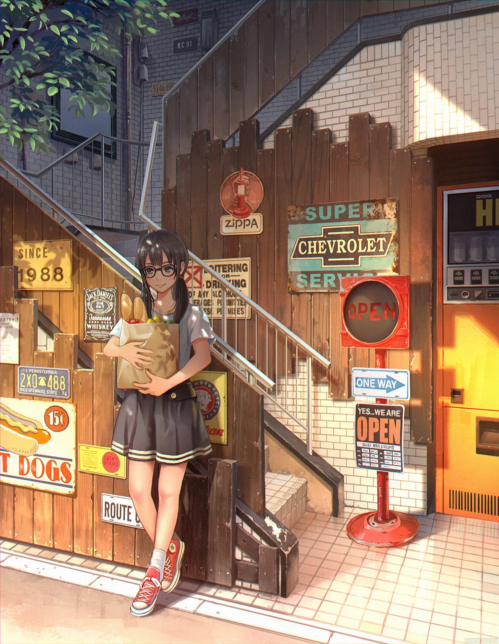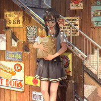 an animated character, a young girl with glasses and short brown hair, sitting on the steps of what appears to be a shop. She is holding