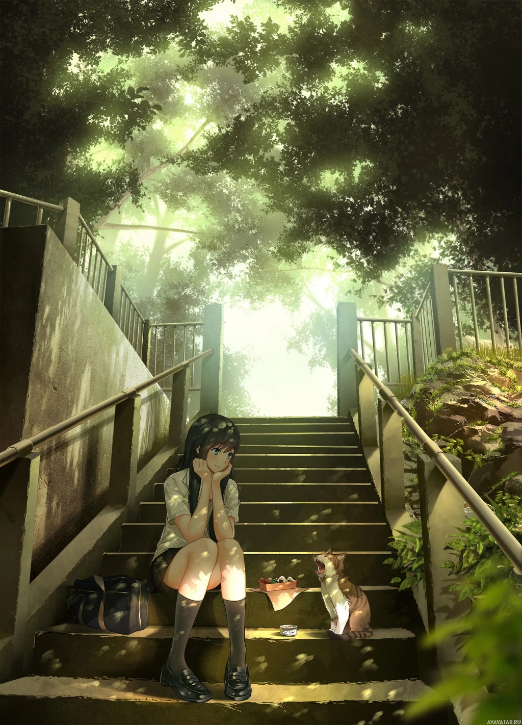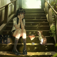 a young girl sitting on a set of stairs with her head resting on her hand. She appears to be in a contemplative or thoughtful pose. Next to her is a cat lying down comfortably on the stairs. There's also a dog, which seems to be looking at something with interest. The surroundings suggest