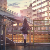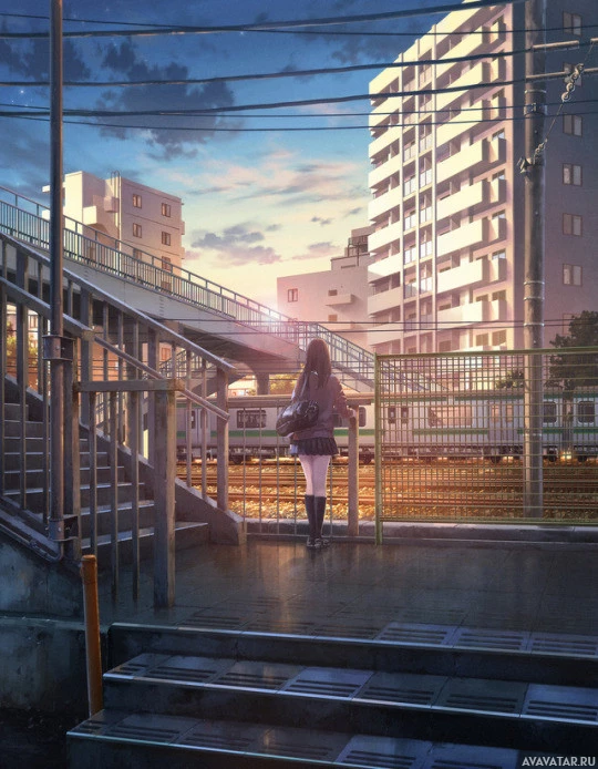 train tracks with her hand on the railing of a staircase that leads up to a platform where a train is passing by. It's set in what seems to be
