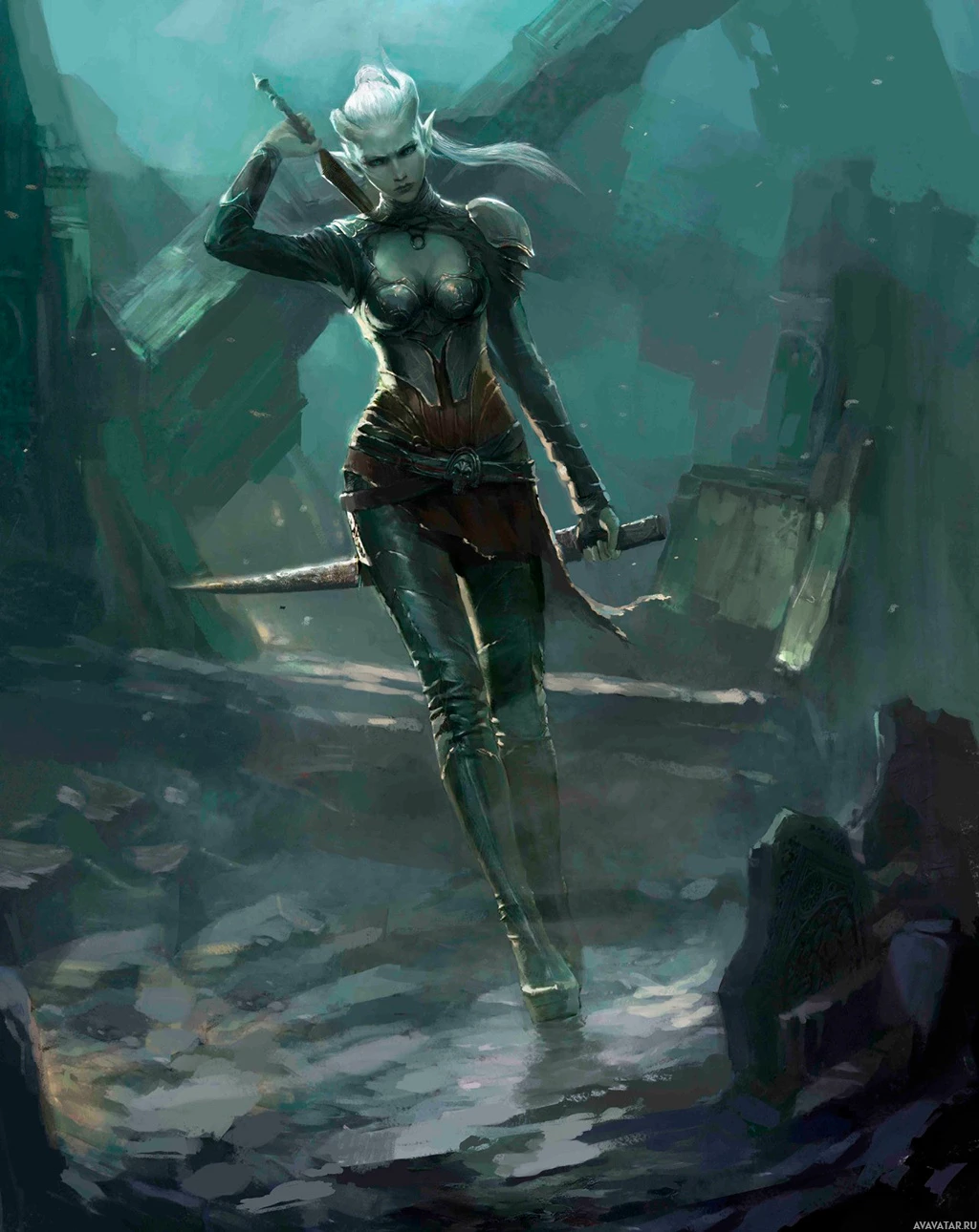 the fantasy genre, specifically portraying a drow. The character is depicted with