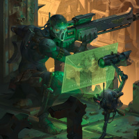 fictional world. There are also robotic elements in the background, adding to the overall tech-