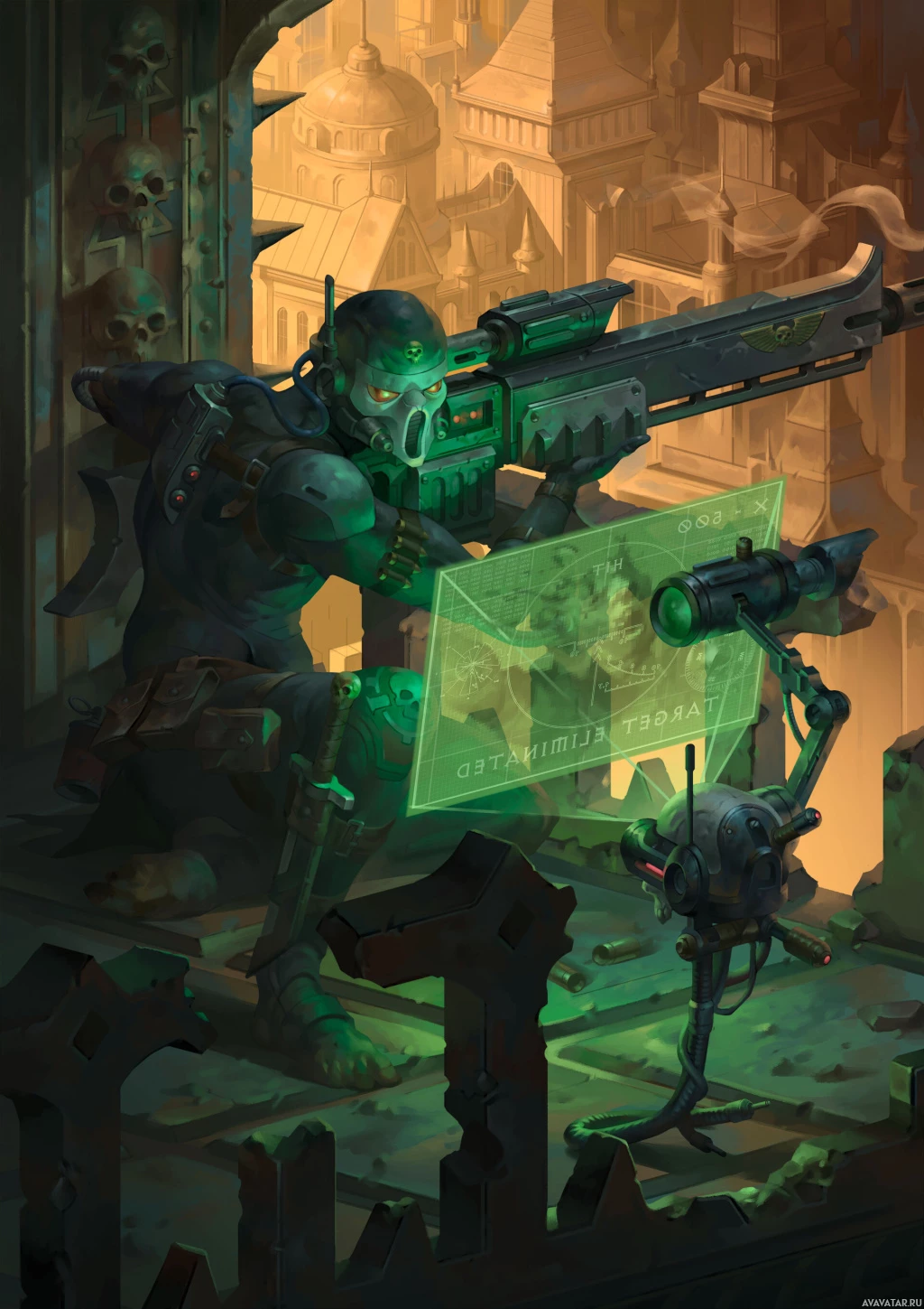 science fiction, featuring a character holding a weapon. This appears to be an illustration rather than a photograph. The setting looks like a dystopian or