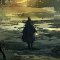parts of the landscape and buildings. There are no people other than the individual with the lantern, contributing to