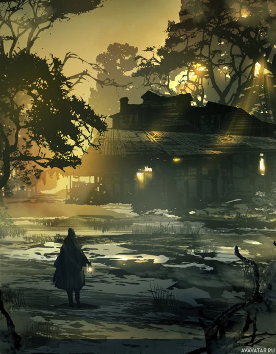 The image depicts a scene set in what appears to be an old, dilapidated village during either dawn or dusk due to
