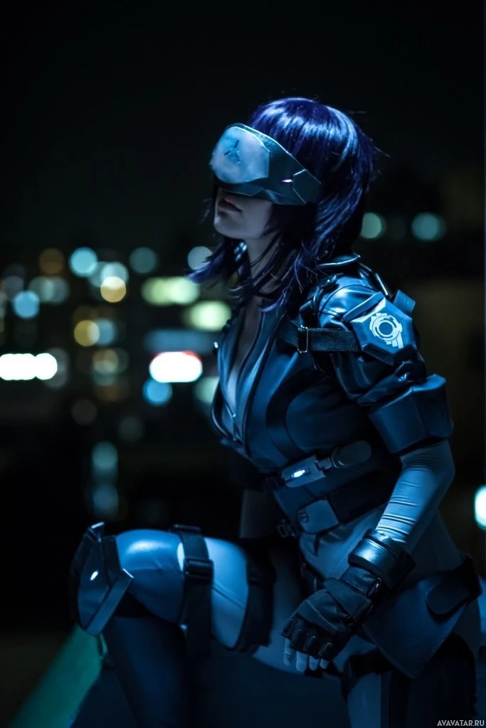blue hair and is looking downward. The background appears to be nighttime with city lights visible in the distance, suggesting