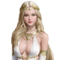 blonde hair complements her outfit, which seems to be inspired by ancient Greek or Roman clothing, often associated with goddesses or deities from mythology. The character has an elegant and regal presence, and the artwork suggests that she could be part of