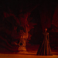 the central characters in the series, perched behind a man who appears to be a character from the show. The setting looks like a castle or medieval fortification with dark