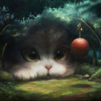 wide eyes and alert expression. In front of the cat is an apple hanging from a branch. The background suggests a forest or woodland setting with fog and trees, creating a mysterious and enchanting atmosphere. There's a hint of magical realism in this image due to the cat's unusual position and the juxtaposition of the ordinary apple with the fantastical