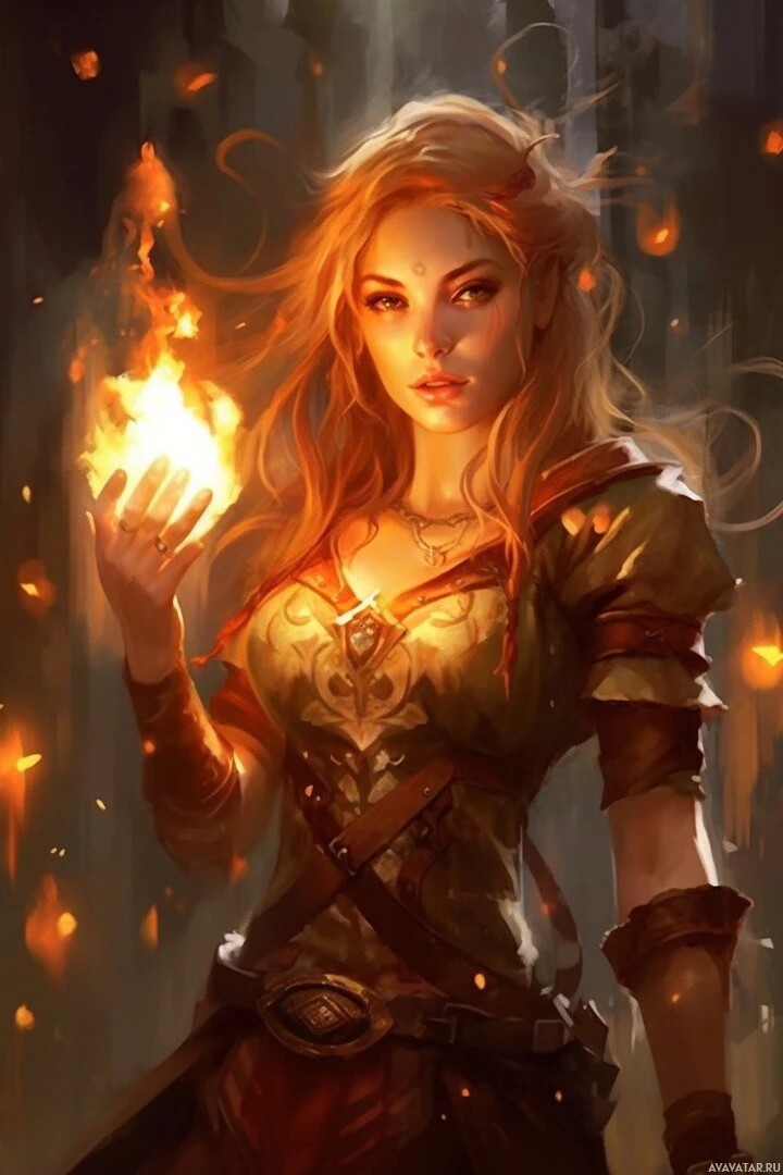 На картинке изображена женщина с рыжими волосами, в средневековых доспехах и с пламенем в правой руке. Она смотрит прямо на зрителя. Этот тип произведений искусства обычно встречается в жанрах фэнтези, где такие персонажи часто изображаются как волшебники или колдуны с магическими способностями.