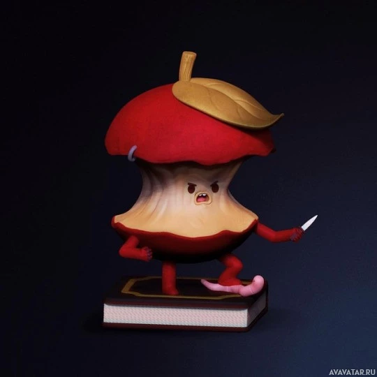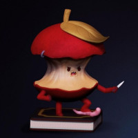 an animated character that appears to be a stylized anthropomorphic apple. It has a face, arms, and legs, and is depicted in