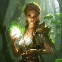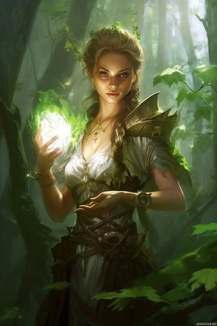 a female character with a fantasy theme. She is situated in what appears to be a dense
