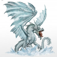 The image depicts a fantasy-themed illustration of a dragon. This creature has wings, scales, and a tail, all rendered in an ice or snow theme due to the icicles hanging from its body. The dragon is standing on what appears to be frozen water with icicles hanging off it, suggesting