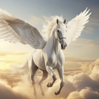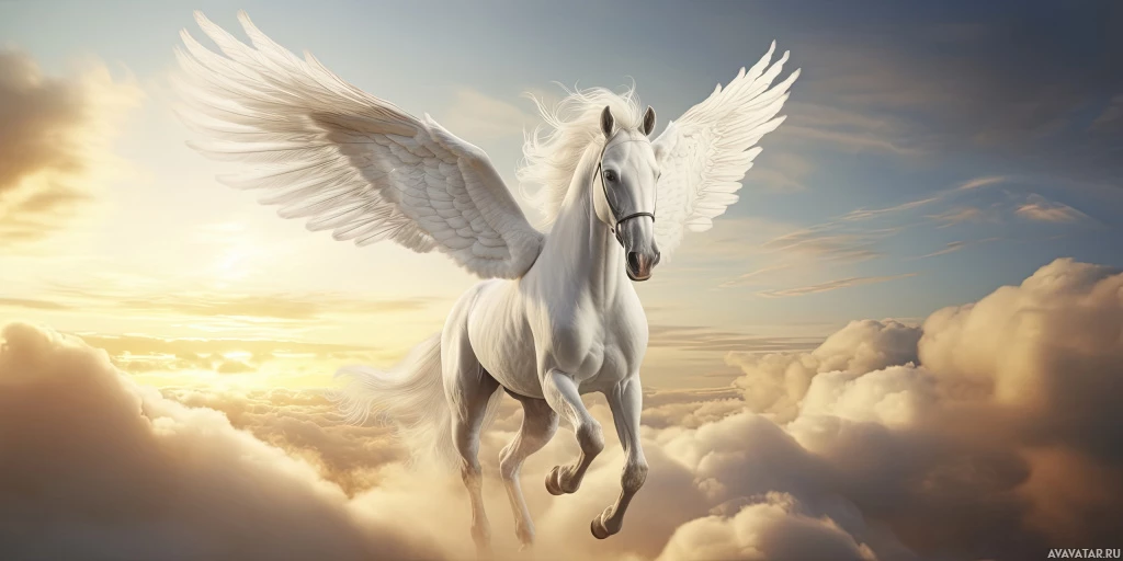 a mythical creature with the body of a horse and wings. This particular pegasus has wings fully unfurled as it appears to be flying or galloping through the sky. There are clouds around it, suggesting