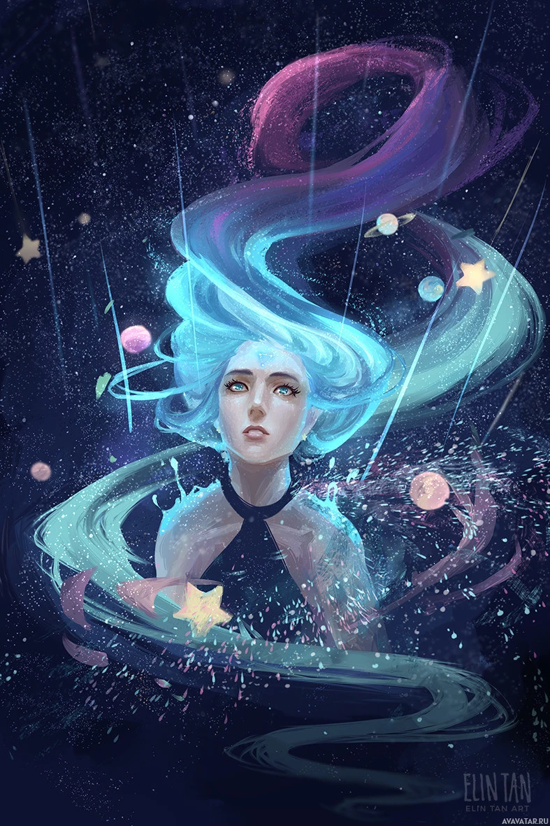 blue hair and an ethereal appearance, set against a space theme. The person has