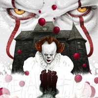 sky with clouds that resemble blood droplets, reinforcing the horror theme. There is also an image of a house in the middle of the artwork, which might be associated with Pennywise or another figure from
