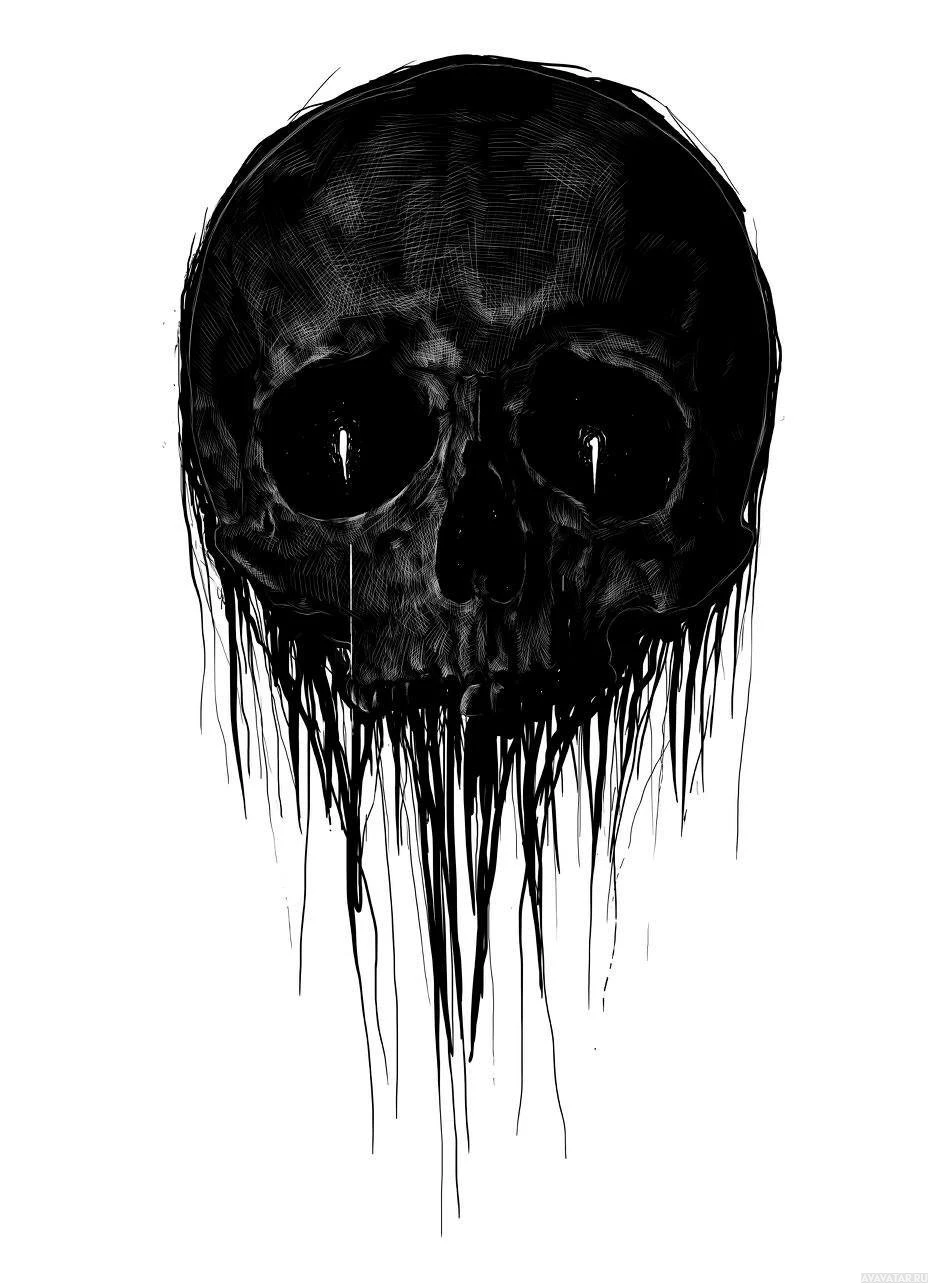The image features a black and white illustration of a skull. The skull is prominently displayed against what appears to be