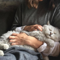 На картинке изображен человек, держащий кошку. Кошка, кажется, удобно отдыхает на коленях человека и выглядит довольным. Они оба сидят на диване или удобном кресле в помещении.