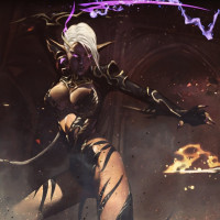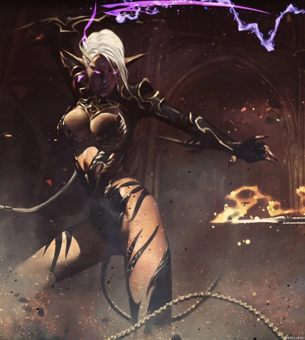 a fantasy scene, featuring an individual who appears to be a drow character from the Dungeons & Dragons role-playing game. This creature is known for its