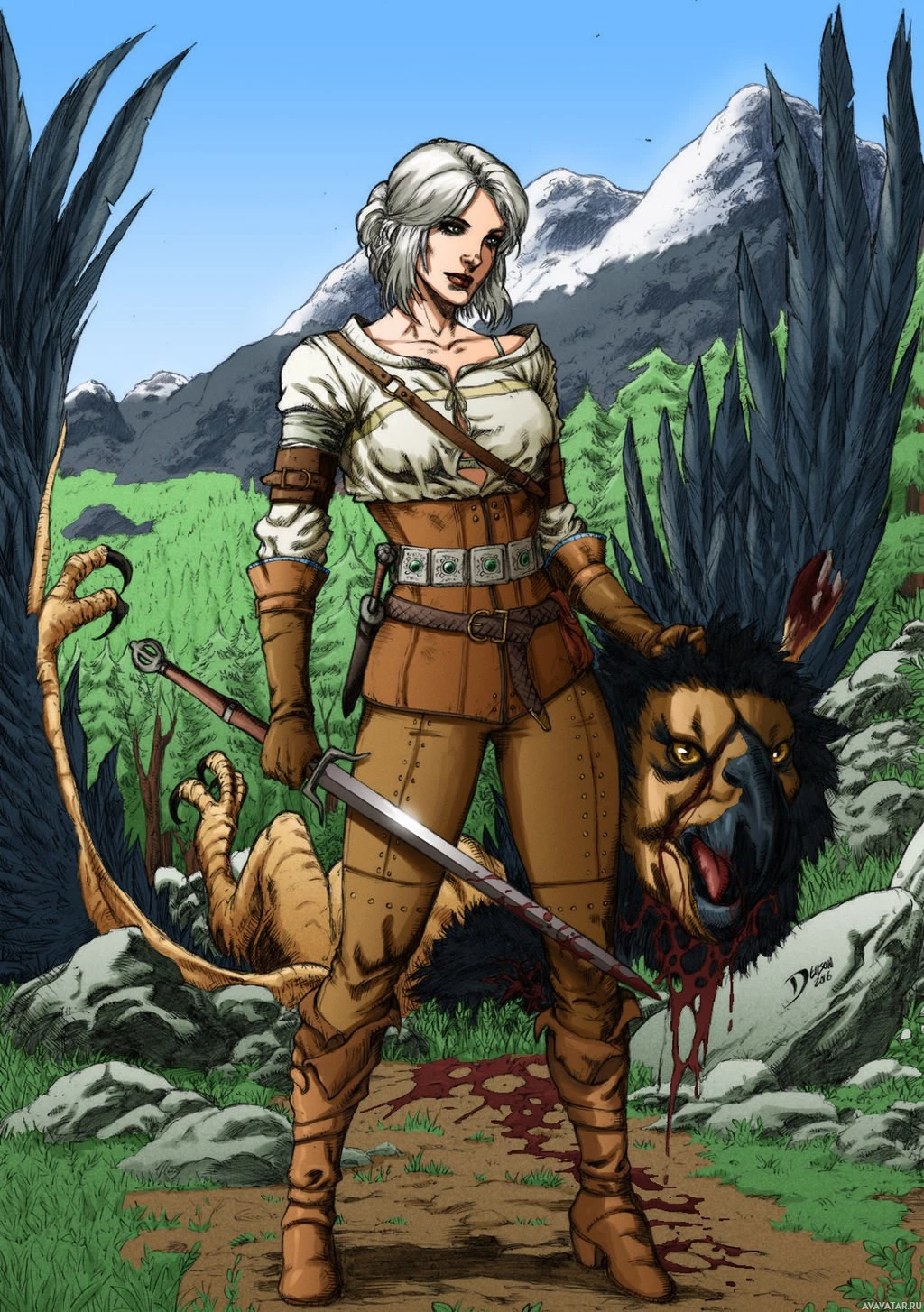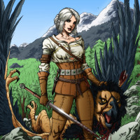 На картинке изображен персонаж по имени Чири из видеоигры «Ведьмак 3: Дикая Охота». Она стоит в лесу с скальными образованиями на заднем плане, носит доспехи и владеет мечом. Рядом с ней находится мертвый дракон. Эта сцена захватывает персонажа Цири, когда она отправляется в различные квесты в игре.