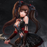 black hair and bangs that cover her eyes, wearing a red and black outfit that resembles a costume inspired by the theme of vampires or gothic fantasy elements. She is holding what appears to be a sword in one hand and a shield in the other, suggesting she might be portraying a warrior or a character with some