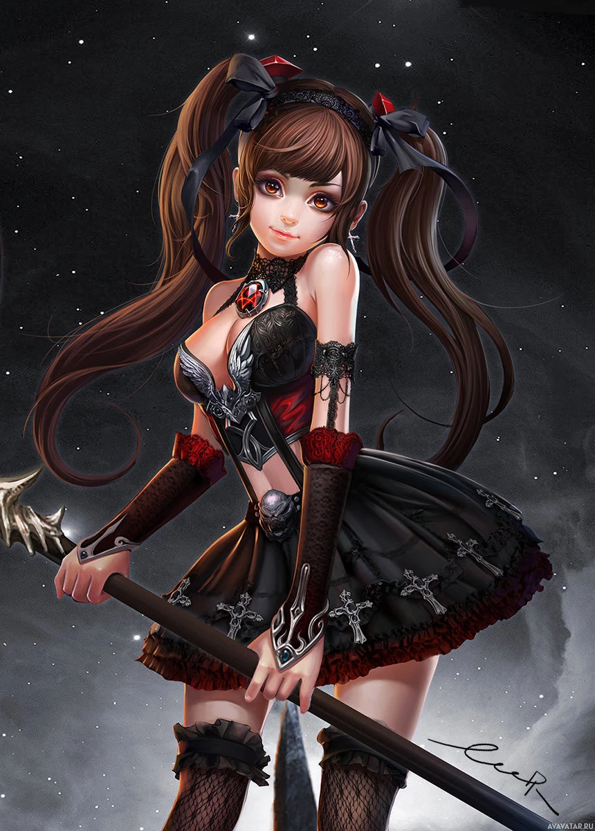 an animated girl with a dark, gothic style. She has long