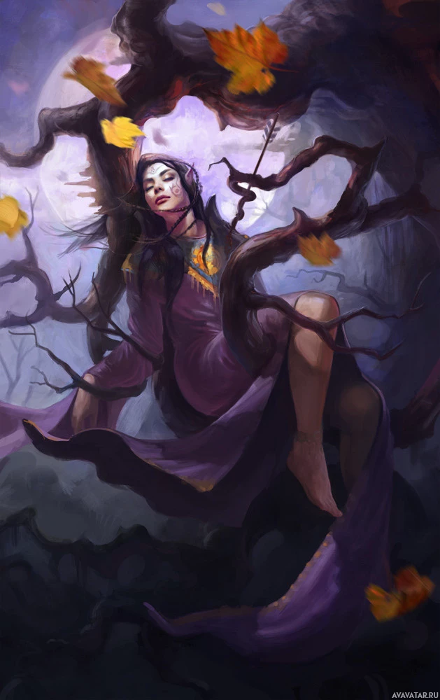 brown hair and is wearing a purple dress, appears to be in a state of deep thought or perhaps even asleep, given that her eyes are closed. She is seated on what seems to be a branch from a tree, which adds a touch of