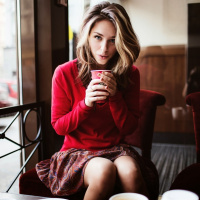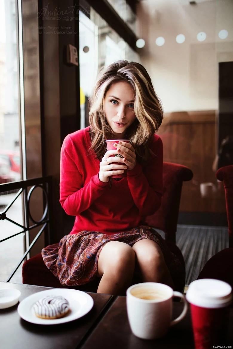 a coffee shop or a similar setting. She is wearing a red sweater and has her hand raised near her mouth as if she's either sipping from