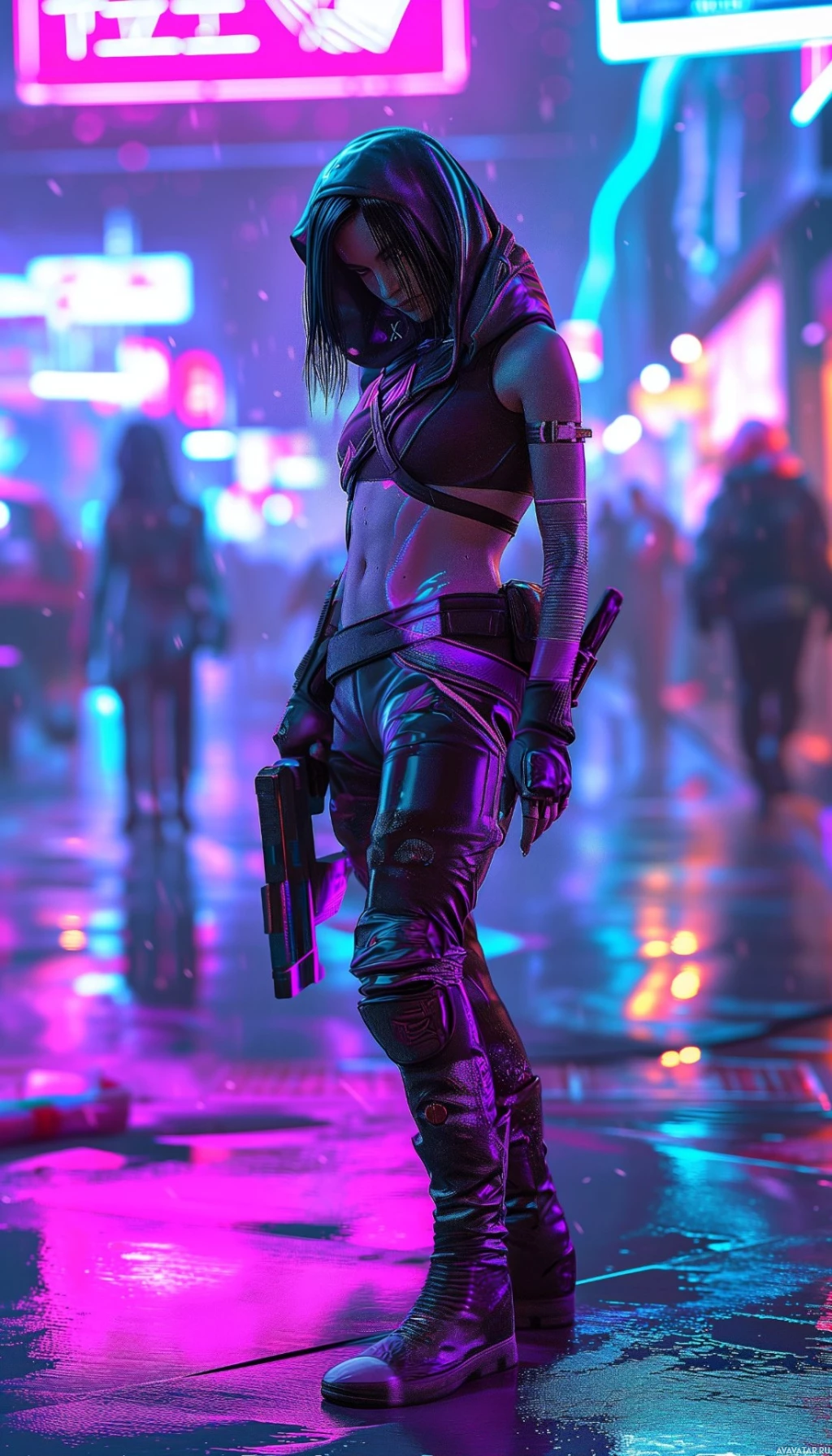 blonde hair, and her attire appears to be inspired by futuristic or cyberpunk aesthetics. In her hands, she is holding a gun with one hand, suggesting she might be prepared for combat or self-defense in this setting.