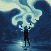 shades of blue and grey dominating the scene. There is also a hint of starlight, suggesting that this might be set at night. The person appears to be wearing