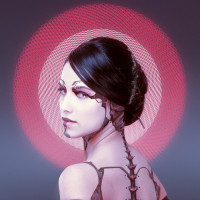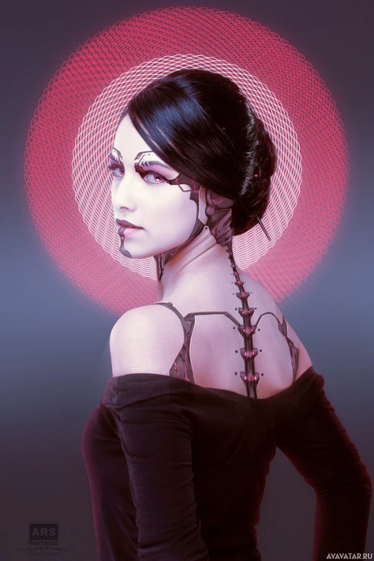a complex tattoo or design that suggests she might have cyberpunk-style elements. The lighting in the photo creates