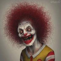 a yellow shirt with the McDonald's logo, which contrasts sharply with the disturbing features of the face. The overall impression is one of a grotesque