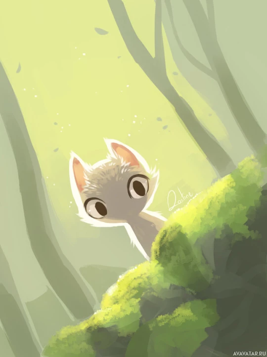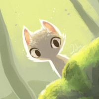 a whimsical scene with a character that resembles a stylized fox. The fox is sitting among what appears to be mossy rocks or