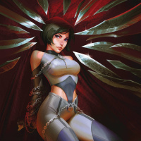 readiness for combat or perhaps having just engaged in one. The overall aesthetic of the image has a fantasy theme with a blend of