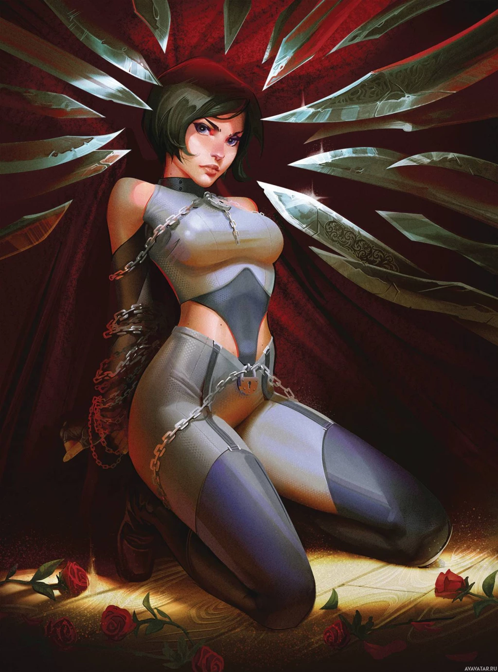 dark hair and is kneeling on what seems like a battlefield with rose petals scattered around her, suggesting she might be taking a moment of rest amidst battle. Her attire consists of a sleek,
